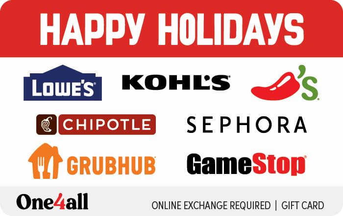 Give a gift that always fits. Make it a happy holiday for everyone on your list with a foolproof gift they’re sure to enjoy. Exchange this HAPPY HOLIDAYS Choice Gift Card at redeem.giftcards.com for a choice of eGift(s) to spend at one or more of these brands: Chili’s, GameStop, Grubhub, Kohl’s, Lowe’s, Sephora and Chipotle.